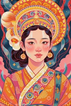 This painting depicts a person dressed in exquisite traditional clothing, full of vitality and color. This person is wearing a headpiece decorated with complex patterns and bright colors, including orange, yellow and pink. The headdress is characterized by its circular and oval designs, as well as a large feather-like decoration. This person's face is adorned with striking makeup, including white lines and swirls, giving a sense of drama and art. The overall composition is rich in color and detail, emphasizing traditional and artistic elements