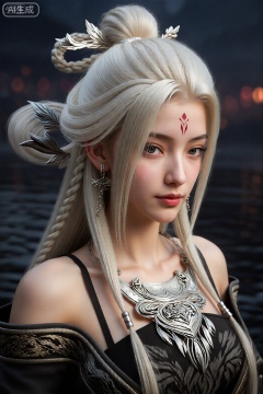 该图像描绘了一位高度细致的数字渲染女性形象,她有一头白金长发,盘成精致的高髻,配有复杂的辫子和带有金属和叶状元素的装饰假发。她有着引人注目的特征,包括充满表情的大眼睛和柔和的目光、精致的小鼻子和饱满的粉红色嘴唇。她的额头、眉毛之间有一个红色的几何纹身。 她戴着华丽的珠宝:一条大银项链,上面有复杂的、可能是部落或幻想风格的设计,包括一个类似面具或脸的中心图案。她的耳朵上装饰着多个银耳环,包括一个长而悬垂的耳环和较小的耳钉。 她的服装是一件无袖上衣,底色为黑色,边缘有金色刺绣图案,让人联想到幻想或历史风格的服装。背景模糊,呈现出黑暗的、可能是夜间的环境,并带有温暖、发光的灯光,形成了鲜明的对比,突出了人物的特征和服装。整体美感空灵而超凡脱俗,对纹理和灯光的细节一丝不苟。