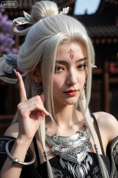 这张照片上的人物有一头白金金色的长发,盘成精致的髻,脸上有一些发丝。该人戴着一条设计复杂的精致银项链,以及带有装饰图案的配套银袖口。这个人用食指指向上方,指甲修剪整齐并涂成白色。背景暗示着传统建筑的户外环境,可能是寺庙或历史建筑,左侧可见一些紫色的花朵。灯光明亮,突出人物的特征和配饰的金属细节。整体风格似乎受到奇幻或历史主题的启发。