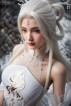 这张照片上的人物有一头长长的、飘逸的白发,有着柔软的波浪和卷发。头发上装饰着精致的银色发夹,上面有悬垂的珠子和复杂的设计。此人拥有引人注目的透明皮肤,脸颊上有淡淡的红晕,左眉毛上方的前额上有一个红色的小花卉纹身。眼睛大而富有表情,目光柔和,嘴唇涂成鲜红色。 这件衣服是一件白色的、飘逸的衣服,带有透明的蕾丝纹理。这件衣服饰有复杂的旋转金色图案,类似于花卉或抽象设计。衣服的肩带细细而精致,领口处挂着小金珠。背景模糊,深色和浅色混合,暗示着自然的、可能下雪或有雾的环境。整体美感优雅超凡脱俗,注重精致的细节和宁静、神秘的氛围。