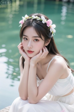 肖像特写凸显柔美气质。白衣女子佩戴白粉相间的发饰,双手托腮的姿势温柔雅致。碧绿池水作为背景纯净通透,水面倒影隐约可见,聚焦于人物明亮眼眸与清新妆容。中心构图强化主体表现力,柔和光线与低饱和度色调共同烘托出梦幻般的静谧美感。