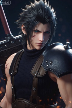 - 形象特征:黑色spike 发型,佩戴耳饰,面部有疤痕,身着黑色高领无袖毛衣与黑色肩甲,肩部装备细节丰富,背后可见大型武器的部分结构。