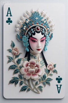 海报设计风格,极简风格,大胆前卫的3D立体画面设计,京剧花旦的设计,点翠绢花刺绣技艺融合,结构宽大,横向拉伸感明显,具有张力,苏绣线条艺术排列组合,空灵唯美,刺绣艺术的几何曲线切割, 空间紧凑,视差错位,拼接组合,保留观赏性的同时增强了未来视觉流动效果。唯美大气,高级审美,大师风格。雅致配色,水晶工艺,扑克牌
