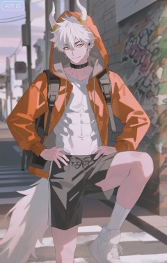 Small note art style,,xiaozhitiao,yu xuan,multicolored hair,White dragon tail,White dragon horns,yellow eyes,white hair,blonde hair,1boy,bangs