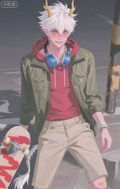 masterpiece, best quality, highres, absurdres, perfect lighting, male, masculine, athletic, toned legs, six - pack abs, sweat glistening, tan skin, (an excited, fearless expression, blushing from the rush:1.4), nose piercing, (a shark - tooth - patterned hood on a red hoodie:1.3), star - burst facial mark, band - aid on knee, (stickers of skate brands on face:1.2), (wearing a distressed, olive - green military - style jacket over the hoodie:1.4), (a long, zebra - print scarf wrapped around the neck twice:1.4), (wearing baggy, khaki cargo pants:1.2), (white cotton socks:1.2), mid - air while doing a skateboard trick in an abandoned skate park, (holding the skateboard by the edge:1.4), (a spray - painted "Skate or Die" sign in the background:1.4), colorful ramps, broken concrete, dynamic pose, action - packed art, , high - angle view, detailed skateboard graphics, (skate - culture theme:1.3), (earthy - bright color theme:1.2), (dynamic - motion theme:1.4)