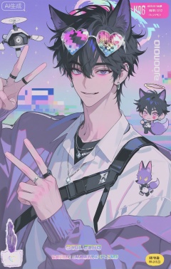 (artist:mazjojo:0.83), (artist:pigeon666:0.67), (artist:zawar379:0.77), (artist:remsrar:0.65), (artist:yoneyama mai:0.74), (artist:chimmyming:0.72), masterpiece, 4k, hd, HDR, amazing quality, best quality, high resolution, goldenfieldszho, newest, very aesthetic, ultra-detailed, absurdres, perfect lighting, volumetric lighting, (neon lighting), shadowing, (good shadowing), depth of field, scenery, amazing aesthetics, cinematic lighting, cinematic, shading, (good shading), counter_shading, subsurface scattering, intricate details, illustration, perfect hands, handsome, 1boy, solo, male focus, bishounen, long hair, hair between eyes, lavender hair, pink eyes, playful smile, toned male, skinny, eyewear on head, (pixelated heart glasses:1.4), holographic crown, (glitching data halo:1.5), star hairclip, ear piercings, jewelry, multiple necklaces, pixel heart earrings, ear chain, multiple rings, v, pink halo, (purple fox ears:1.3), (nine fluffy purple fox tails:1.3), purple iridescent sweater, (glitching heart print:1.4), off-shoulder sweater, white collared shirt, non-humanoid robot, (floating microphone drone:1.5), multicolored background, (purple background:1.4), (pink background:1.4), (glitch art background:1.3), (colored shadow:1.5), pink shadow, upper body, close-up, dynamic pose, dynamic angle, beautiful background, detailed background, magazine cover, (fake cover:1.8), (chibi inset:1.9), glint, lens flare, light particles, Chip7SKTest