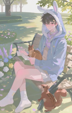 masterpiece, best quality, highres, absurdres, perfect lighting, male, masculine, athletic, muscular, well - defined abs, a light sheen of sweat, light skin, (a content, laid - back expression, blushing gently from the sun:1.4), single ear piercing, (a fluffy, bunny - eared hood on a pastel - blue hoodie:1.3), heart - shaped facial mark on the cheek, small band - aid on the finger, (stickers of cute animals on face:1.2), (wearing a light - weight, beige linen shirt unbuttoned over the hoodie:1.4), (a long, lavender - colored knitted scarf with tassels draped over the shoulders:1.4), (wearing light - blue, straight - leg chinos:1.2), (white cotton ankle socks:1.2), sitting on a wooden park bench, (holding a paperback novel in one hand:1.4), (a small, brown squirrel on the ground near his feet:1.4), dappled sunlight through the trees, colorful flower beds nearby, park birds chirping, soft breeze, dynamic pose, impressionist - style art, three - quarter view, detailed flower petals, (park - relaxation theme:1.3), (soft - pastel color theme:1.2), (serene - nature theme:1.4)