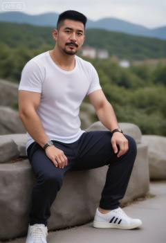 人物特征:1man,solo,looking at viewer,facial hair,pectorals,watch,wristwatch,chest hair,arm hair,crew cut,Fat covered muscle physique,mustache,T-shirt,