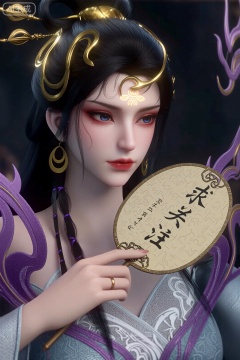 插画,笔触细腻丰富,线条流畅自然,明暗对比强烈,超高清,超高画质,黑色蓬松头发随意垂落,发丝泛着亮光,古铜色皮肤,超精致金色配饰首饰,金色图腾,古老部落,服饰,古老图腾文字,金色面纹,闪粉,含情眼,西域装扮,AI艺术,精美出图,大师构图,大师级别的作品,丰富细节,强光,皮肤细腻,阴影刻画,五官刻画,妖治,邪魅,性感,勾引,清冷,人物占比3/2,穿着一件连衣裙,长裙,上半身,手里拿着一把古风椭圆形的扇子里写着三个字”求关注“,千细的腰部,丰满的臀部。