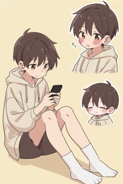 一位可爱的的动漫少年,他穿着一件宽松的米色连帽衬衫和白色长袜。在不同的场景中,她的表情和姿态各异:左侧的角色坐在地上,拿着手机;右侧上方的角色露出害羞的表情,脸颊泛红;右侧下方的角色是个可爱呆萌的头像,整体氛围融洽得当