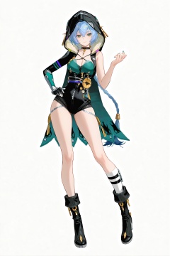 8k,best quality,masterpiece,(ultra-detailed),(high detailed skin),((artist:reoen),(artist:fuzichoco),(artist:atdan),(artist:torino_aqua),year 2024:0.8)1girl,[artist:wlop],[artist:ningen_mame],artist:ciloranko,[[artist:rhasta]],artist:tidsean,colorful,full body,full shot,standing,(solo:1.2),simple background,(white background:1.2),hand on own hip,(white background:1.1),looking at viewer,<lora:Lucia-will-Tanger:0.8>,Lucia \(Zenless Zone Zero\),clothes: Luciadef suit,Square-shaped pupils,yellow eyes,Luciadef cape,Luciadef hood,1girl,breasts,green eyes,hood up,boots,single glove,