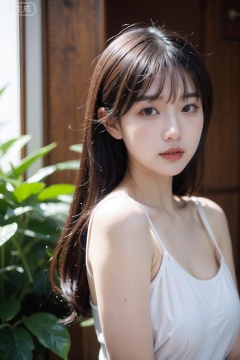 一位年轻女子身着浅绿色带有竹叶图案的无袖上衣,长发乌黑柔顺,部分头发用黑色发簪和装饰物固定在脑后,其余垂落肩头。她佩戴着小巧的耳环,面容清秀,眼神温柔,唇色自然。背景为浅色墙面,右侧有几片绿叶植物点缀,整体氛围清新雅致。