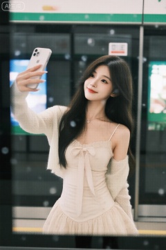 富士胶片风格人像:人像摄影,日常快照风格,非精心构图或打光,一位长发的御姐,葫芦形S身材,穿着法式连衣裙,蝴蝶结飘带,露肩开衫针织上衣外搭,雪纺内衬;场景为地铁站内,在屏蔽门前,用屏蔽门的玻璃作为镜子,用iPhone 后置镜头自拍。