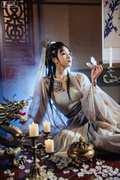 室内古风场景中,一位人物身着带有金色装饰的浅灰色古风服饰,身上有复杂的纹身,头发间插着孔雀羽毛与饰品,头戴轻纱。她的手中停着一只白色的蝴蝶,身旁有燃着的蜡烛、带有龙形装饰的烛台以及金色的香炉,周围散落着花瓣,背景有带有传统纹样的屏风与烟雾,整体营造出神秘且雅致的古风氛围。