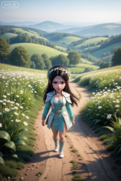 The image depicts a serene countryside scene with a young girl walking along a dirt path surrounded by lush greenery and blooming flowers. The girl is dressed in a light blue outfit with intricate designs, and she has long dark hair adorned with a floral headband. The path curves gently through the landscape, leading towards a misty horizon with rolling hills and trees in the distance. The overall atmosphere is peaceful and idyllic, evoking a sense of tranquility and connection with nature.