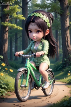 The image depicts a young girl riding a green bicycle on a dirt path surrounded by a forest. She is wearing a light green outfit and has long dark hair tied with a green headband adorned with leaves. The background features tall trees with dense foliage, and there are small yellow flowers scattered along the path. The lighting suggests a bright, sunny day, and the overall atmosphere is serene and playful.