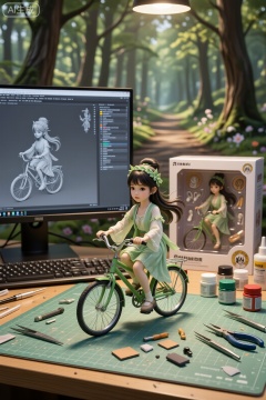The image depicts a young girl riding a green bicycle on a dirt path surrounded by a forest. She is wearing a light green outfit and has long dark hair tied with a green headband adorned with leaves. The background features tall trees with dense foliage, and there are small yellow flowers scattered along the path. The lighting suggests a bright, sunny day, and the overall atmosphere is serene and playful.基于参考图,将角色转换为1/7比例的高完成度PVC静态手办的图片,图片中该角色置于手办制作工作台:电脑屏幕,键盘,浅绿切割垫、喷枪、替换手与面部、镊子、刻刀、尖嘴钳、砂纸条、胶水和颜料罐四散摆放,桌上的电脑屏幕正在显示该手办的三维建模图。手办背后是一只较大的玩具品牌的开窗盒,正面透明塑料窗可看见同款手办的本体和配件。室内暖色灯光,柔和的45°主光+顶补光;单反摄影质感,50mm镜头,f/2.8,浅景深,真实PVC/ABS塑料反射,喷涂阴影、细微合模线与微划痕,桌面反射与颗粒感,背景轻微散景。