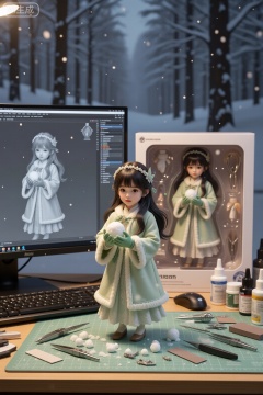 The image depicts a young girl standing in a snowy forest. She is dressed in a light green coat with fur trim and green gloves, and her long dark hair is adorned with a decorative headband and a small leaf-shaped accessory. She is holding a snowball in her hands, which she appears to be about to throw. The background consists of tall, snow-covered trees, and the ground is blanketed with a thick layer of snow. Snowflakes are gently falling, creating a serene winter scene.基于参考图,将角色转换为1/7比例的高完成度PVC静态手办的图片,图片中该角色置于手办制作工作台:电脑屏幕,键盘,浅绿切割垫、喷枪、替换手与面部、镊子、刻刀、尖嘴钳、砂纸条、胶水和颜料罐四散摆放,桌上的电脑屏幕正在显示该手办的三维建模图。手办背后是一只较大的玩具品牌的开窗盒,正面透明塑料窗可看见同款手办的本体和配件。室内暖色灯光,柔和的45°主光+顶补光;单反摄影质感,50mm镜头,f/2.8,浅景深,真实PVC/ABS塑料反射,喷涂阴影、细微合模线与微划痕,桌面反射与颗粒感,背景轻微散景。