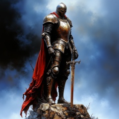 ArsMJStyle, Etherial Gothic, The image shows a knight in full armor holding a sword in one hand and standing atop a rock. The knight is wearing a helmet and a cape and the background is a mix of blue black and white., armor, weapon, sword, solo, helmet, cape, planted, 1boy, planted sword, full armor