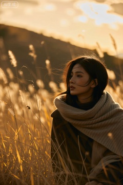 一位女子披着厚实的针织围巾,坐在秋日金黄的草甸里,她的黑发被微风轻拂,几缕发丝飘在脸颊旁,背景是暖调的山坡与黄昏天空,光线是黄昏时柔和的侧逆光,给人物和草甸镀上一层暖金边,整体画面为胶卷风格,带有明显的颗粒感(噪点),色彩呈现出复古的暖棕与金黄调,像被时光晕染过,渲染侧重草茎的干枯质感与针织围巾的毛绒感,色彩浓郁且带着胶片特有的色彩偏差,暖调更厚重,构图采用三分法,人物位于画面右侧,草甸向左侧延伸,拍摄角度为平视,搭配复古胶卷滤镜(模拟富士Pro 400H 胶片质感),使用佳能EOS R5 相机(后期模拟胶卷),搭配RF 50mm f/1.2L 镜头,快门速度1/125s,光圈f/2.0,焦段50mm,通过后期添加胶卷颗粒与色彩偏移,还原复古胶卷拍摄的质感,