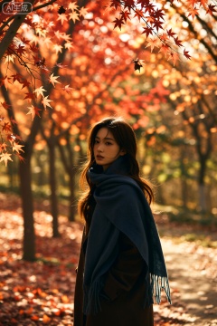 一位女子围着藏青色的羊绒围巾,站在秋日的枫树林小径上,她的头发是温柔的栗棕色,随意披散在肩头,被枫叶缝隙漏下的阳光染成金红,背景是层层叠叠,红得似火的枫树,地面铺着厚厚一层枫叶,像块猩红的绒毯,光线是午后的散射光,柔和却充满力量,把枫叶的红与围巾的深青衬得格外浓郁,画面为胶卷风格,颗粒感(噪点)偏粗犷,带着柯达Portra 400 胶片的色彩浓郁感,红调更饱和,像被岁月加深了印记,渲染突出枫叶的干燥脆感与羊绒围巾的顺滑质感,色彩以猩红,藏青,金棕色为主,营造出热烈又带着复古怀旧的秋日枫林氛围,构图用引导线构图,枫树林小径从画面下方延伸向远方,人物站在小径一侧,拍摄角度为平视,搭配复古胶卷滤镜,使用佳能EOS R6 相机(后期模拟胶卷),搭配RF 24-70mm f/2.8 镜头(焦段设为50mm),快门速度1/160s,光圈f/2.8,后期添加胶卷颗粒与色彩浓化,还原胶片拍枫林的复古热烈感,