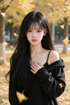 ,(电影级面光:1.6),(光线追踪:1.4),(冷白皮漫感质感的光滑皮肤:1.6),,(人物有最好的骨相:1.2),(网感脸:1.5),(网感妆:1.5)(带有项链:1.1),怀旧感校园,金黄色银杏落叶背景,银杏飘落,纷飞,明亮,拍摄一名女生,一位长发及腰、模样似洋娃娃般可爱的女生,身穿松松垮垮的黑色连帽卫衣。长美甲在闪光灯的照耀下格外亮眼,画面因快门速度不足产生运动模糊,构图随意却尽显生活中的绚丽日常。风吹、锁骨和吊带,害羞,眼睛睁大看向镜头,与镜头的互动感,