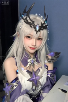 图像显示一个人穿着精致的角色扮演服装。她们有着长长的直发,银白色的头发垂过肩膀。他们的头发装饰着深色、复杂的头饰,头饰上有尖锐的树枝状元素,中心有一颗大而透明的宝石。闪闪发光的小珠子散落在他们的头发上。 那人眸色漆黑,妆容淡雅,唇边带着温柔的笑意。他们穿着复杂的混合颜色服装:主要是白色和紫色,带有银色和深色口音。这套衣服的特点是高领、胸前有星形吊坠和几何图案。还有金属和宝石状的装饰品,包括紫色虹彩肩章和星形胸针。 这个人坐在一张桌子旁,桌子上有一支笔和一些纸。背景是纯蓝色的墙壁,左侧有较暗的区域。总体印象是精心制作的奇幻主题角色扮演,很可能是动漫、游戏或其他虚构作品中的角色。