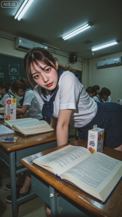 A flash snapshot taken in a quiet Chinese high school classroom during lunch break. Desks scattered with open notebooks, milk cartons, and mechanical pencils. The fluorescent lights above mix with the harsh on-camera flash, creating sharp reflections on the polished desk surfaces.