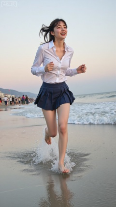 A candid photograph of a young Asian woman with short,tousled brown hair,wearing a white blouse and a pleated blue skirt,joyfully running barefoot in the ocean at sunset. The sky is painted with soft pastel hues,and the waves gently lap at her feet. The image has a grainy,vintage filter.