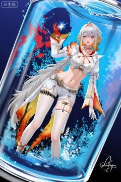 ,jijia,2d,anime,1girl,solo,looking at viewer,in container,see-through,standing,hand up,character name,black background,reflection,copyright name,gradient,a glass bottle with a picture of a woman on it,a picture of a girl inside a clear container with a bunch of stuff in it,interval glass,inside the container,glass separation,