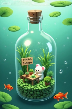 The image depicts a whimsical underwater scene. At the center is a transparent glass bottle filled with lush green plants, creating a miniature indoor garden. Inside the bottle, there is a small, white, round creature resembling a bear with pink ears, sitting at a wooden table. The table has a sign that reads "I'm a plant, I'm happy," and there are various potted plants and a small green object, possibly a fruit or a toy. The bottle is surrounded by a bed of smooth, green pebbles, and there are two orange fish swimming near the bottom of the image. Above the bottle, the water is clear, with floating green lily pads and bubbles. The overall atmosphere is serene and playful, blending nature with a fantastical indoor setting.
