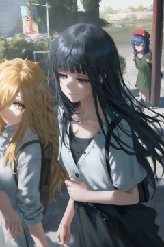 masterpiece,best quality,amazing quality,very aesthetic,absurdres,best quality,newest,(artist:quasarcake:0.8),extreme aesthetic,(wlop:0.9),masterpiece,best quality,good quality,newest,very aesthetic,absurdres,A shot with tension,Visual impact,giving the poster a dynamic and visually striking appearance,offcial art,splash of color,movie perspective,multiple girls, 3girls, blue hair, blue eyes, blonde hair, long hair, black hair, hat, shirt, purple eyes, backpack, beret, yellow eyes, outdoors, bag, smile<lora:journey-000004:0.8>,