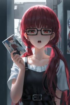 masterpiece,best quality,amazing quality,very aesthetic,absurdres,best quality,newest,(artist:quasarcake:0.8),extreme aesthetic,(wlop:0.9),masterpiece,best quality,good quality,newest,very aesthetic,absurdres,A shot with tension,Visual impact,giving the poster a dynamic and visually striking appearance,offcial art,splash of color,movie perspective,Yui Unoki, 1girl, solo, glasses, long hair, open mouth, black-framed eyewear, anime coloring, red hair, red eyes, holding, looking at viewer, brown eyes, collarbone, masu<lora:journey-000004:0.8>,