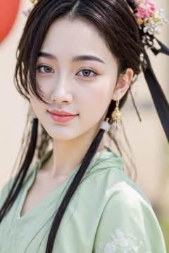 1girl,solo,long hair,looking at viewer,smile,black hair,hair ornament,long sleeves,jewelry,closed mouth,upper body,flower,earrings,hair flower,hair bun,blurry,blurry background,light green chinese clothes,single hair bun,realistic,hair stick,hanfu,