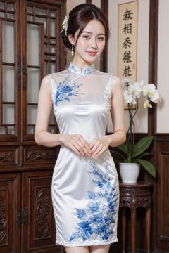 The image depicts a woman dressed in an elegant white and blue silk dress adorned with delicate floral embroidery. She is standing in a room that has traditional Chinese decor, including a wooden cabinet with intricate carvings, a potted orchid plant, and a wall with calligraphy. The woman's hair is styled in an updo, embellished with white flowers and decorative pins. The overall setting has a serene and classical aesthetic., halter neck cheongsam, cheongsam