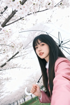 真实照片风格,明快美学,一位黑色长发女生身穿粉色外套,在白色樱花树下撑着透明伞自拍,背景明亮、白天,斜向构图,一只樱花树作为前景,女孩看向镜头,氛围清新自然,真实光线还原,无滤镜无美颜。