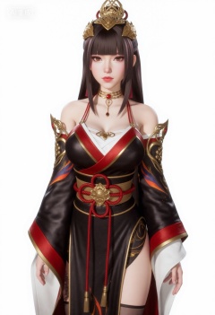 mimi,You Yi Han,cowboy shot (mid-thigh up),mimi,looking at viewer,front view,, long straight dark brown hair with bangs styled with an ornate golden crown and a red rope tied at the back,warm amber eyes,golden choker with red gemstone,matching dangling earrings with crimson tassels,off-shoulder fantasy robe in black and deep red with gold trim,layered white undergarment,thick crimson rope belt tied in a decorative knot at the waist,ornate golden shoulder guards with dragon-scale patterns and embedded red gems,wide flowing sleeves with red and gold accents,high-slit asymmetrical hemline revealing legs,sheer black thigh-high stockings,black fabric with subtle wave patterns accented with swirling flame-like designs in orange and blue,, plain white background,studio lighting,sharp focus,, Negative prompt: ng_deepnegative_v1_75t,(badhandv4:1.2),EasyNegative,(worst quality:2),,nsfw, Steps: 30, Sampler: Euler, CFG scale: 3.5, Seed: 2170785552, Size: 832x1216, Model hash: 0734f0ab2a, Model: F.1 模型下载版-黑暗森林工作室_fp16.sft, Denoising strength: 0.4, RNG: CPU, Lora 1: 20251022-1761149905385-0008, Lora Hash 1: 278bdf9851, Lora Weight 1: 0.75, Lora 2: 金宝-F.1-妆容.美颜.磨皮。三合一, Lora Hash 2: 9fa9e2a424, Lora Weight 2: 0.2, vae_name: automatic, Hires resize: 1664x2432, Hires steps: 30, Hires upscaler: 4x-UltraSharp