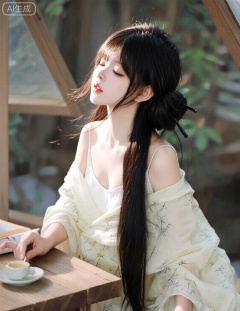 背景是一扇木质窗框的窗户,窗框带着岁月沉淀的温润质感,窗外能瞥见朦胧的绿意,似是茂密的植物,光线透过窗户柔和地洒入,给画面蒙上一层暖调的光晕,让整个场景既有着室内的静谧,又与室外的自然绿意相融合,进一步烘托出清幽、恬淡的意境,每一处细节都交织出古典与诗意的美感
