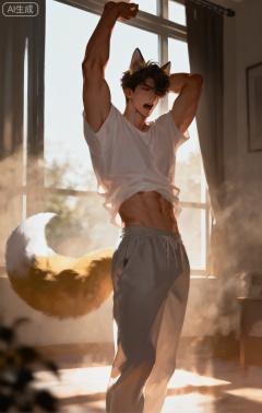 (standing in front of a large window, one hand pulling open the curtains to greet the day:1.4),(stretching his other arm up towards the ceiling:1.3),