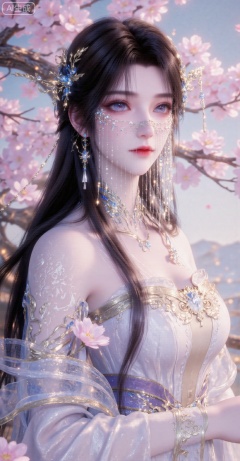 High - definition 8K, ultra - detailed. Xianxia - style beauty, long flowing dark hair with exquisite silver and gemstone hair ornaments. Large, charming peach - blossom eyes with delicate makeup, bright red lips, porcelain - like smooth and flawless skin. Wearing a light purple and translucent fairy - like gown with elaborate golden embroidery patterns, soft and flowing silk sleeves, adorned with shiny gold and gemstone accessories. The background is a dreamy scene of pink cherry blossoms in full bloom, with petals gently falling, branches elegantly stretching, and a soft, diffused light creating a celestial atmosphere. Rendered with Unreal Engine - like textures, in a neo - traditional Chinese color palette of light purple, pink, and light blue gradients, with particle effects for a more ethereal feel. Fantasy realism style, trending on ArtStation.,anmy