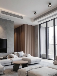 nuantool,Modern minimal living room with ceiling linear AC (narrow metal grille with track lights), micro-cement walls (Morandi gray), matte sintered stone floor (antibacterial). Core: floating modular sofa (memory foam), sintered stone tea table (wireless charging), hidden door to study (press-lock). Smart: AC AI learning (auto-temp by schedule), hidden lighting, precise venetian blinds. Materials: micro-cement × sintered stone × matte metal.