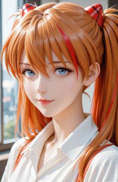 masterpiece,best quality,amazing quality,very awa,very aesthetic,absurdres,highres,intricate details,detailed face,detailed eyes,detailed background,skindentation,impactful picture,stunningly beautiful,1girl,solo,eyelashes,lipstick,looking_at_viewer,streaked hair,light smile,(alternate costume:1.2),big hair,hair ornament,white shirt,collared shirt,close up,portrait,(Asuka Langley Soryu,red hair,twintails),