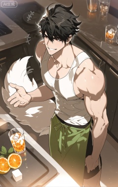 (artist:mazjojo:0.83),(artist:pigeon666:0.67),(artist:zawar379:0.77),(artist:remsrar:0.65),(artist:yoneyama mai:0.74),(artist:chimmyming:0.72),masterpiece,4k,hd,HDR,amazing quality,best quality,high resolution,goldenfieldszho,newest,very aesthetic,ultra-detailed,absurdres,perfect lighting,volumetric lighting,(bright, sunny kitchen lighting),shadowing,(good shadowing),depth of field,scenery,amazing aesthetics,cinematic lighting,cinematic,shading,(good shading),counter shading,subsurface scattering,intricate details,illustration,perfect hands,1boy,handsome,interesting,male focus,bara,sexy,solo,focused on his task,