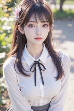 A fashionable girl with brown hair in pigtails, showing hair strands, in a realistic style. She is wearing a white shirt paired with a pleated skirt, and a black ribbon is tied at the collar. Natural light. Outdoor setting.