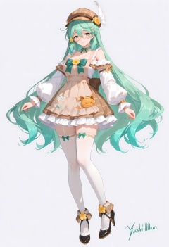 front view,((((full_body:1.4)))),(artist:kousaki rui:0.4),(artist:agm:0.6),(artist:arutera:0.6),masterpiece,hyper quality,amazing quality,absurdres,signature,(((((signature:yushililuo:1.5))))),solo,1girl,standing,simple background,white_background,eyeshadow,<lora:神曜灵绘·缪可:1>,miuke,1girl,long hair,bangs,hair ornament,hat,green eyes,flower,green hair,glasses,hairclip,hair flower,aqua hair,yellow flower,round eyewear,brown headwear,hat flower,monocle,plaid headwear,breasts,thighhighs,long sleeves,dress,bow,bare shoulders,very long hair,multicolored hair,frills,puffy sleeves,off shoulder,black footwear,apron,high heels,white thighhighs,gradient hair,detached collar,green bow,puffy long sleeves,round eyewear,brown headwear,choker,frilled choker,green choker,white shirt,detached sleeves,shoes,high heels,frilled sleeves,wreath anklet,smile,