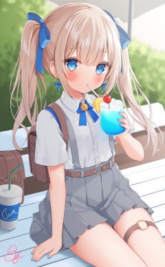masterpiece,absurdres,best quality,loli,petite,high quality,chromatic_aberration,//,1girl,blue_eyes,skirt,drinking_straw,solo,white_shirt,shirt,twintails,grey_skirt,pleated_skirt,holding,cup,short_sleeves,looking_at_viewer,drinking_straw_in_mouth,holding_cup,thigh_strap,blonde_hair,earrings,drinking,sitting,blue_nails,food,long_hair,drink,blush,jewelry,collared_shirt,cherry,fruit,drinking_glass,belt,nail_polish,pouch,hair_bow,bow,signature,blue_ribbon,o-ring_thigh_strap,shirt_tucked_in,thighs,ribbon,hair_ribbon,blue_bow,cross_earrings,//,<lora:nuhutya——【noob】hans:0.9>,