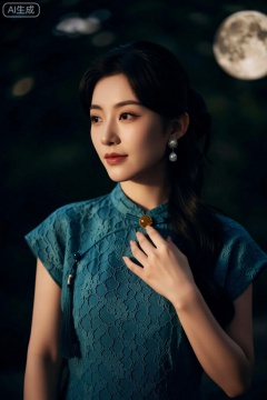 一位女性身着镶着蕾丝的藏青连衣裙,佩戴琥珀胸针,在月光与夜色的明暗交替中,散发着复古温柔的神秘魅力。,优雅女性