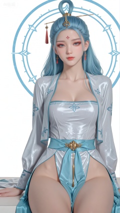 SN clothes, solo, exquisite skin, sitting, cowboy_shot, looking at viewer, even illumination, very awa, Solid Blue and white aperture