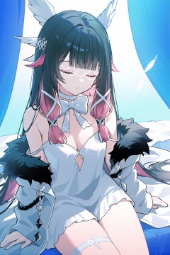 yejji,Ryuzaki Ichi,Rosuuri,ka ra ra ge tsu ne,Columbina\(genshin impact\), 1girl, eye mask, solo, multicolored hair, breasts, white mask, black hair, long hair, closed eyes, fur trim, sitting, two-tone hair, coat, cleavage, bare shoulders, fur-trimmed coat, off shoulder, white bow, bow, white coat, sleeping, wings, wing hair ornament, medium breasts, head wings, pink hair, streaked hair, thighs, blunt bangs