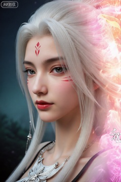 图像显示了一个有着长长的、飘逸的白发的人物的特写。该角色肤色苍白,涂着红色口红。他们的额头上,有着一道红色的火焰般的印记,两条红线从眼眸中延伸出来。该角色佩戴一条带有蝴蝶吊坠的银项链。背景是深色和浅色区域的混合,右侧明亮多彩,具有发光、空灵的效果,具有粉色和橙色色调以及黄色翼状符号。背景的左侧更暗,更像森林。图像右侧有汉字文字,这似乎是设计的一部分。整体美学以奇幻为主题,重点关注角色的详细外观和充满活力、超凡脱俗的背景。